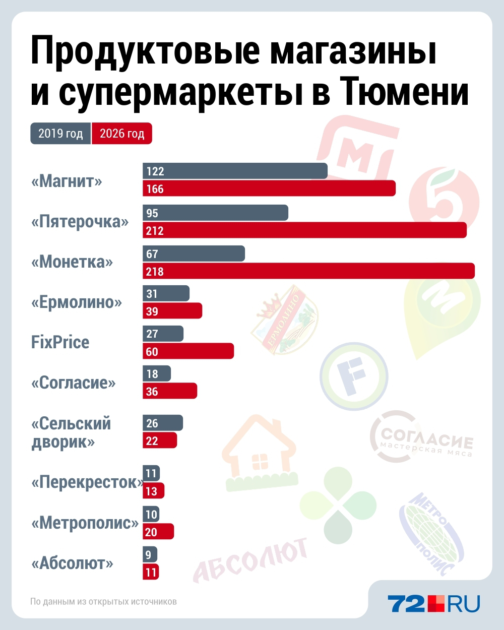 Изменение количества супермаркетов в Тюмени с 2019 года