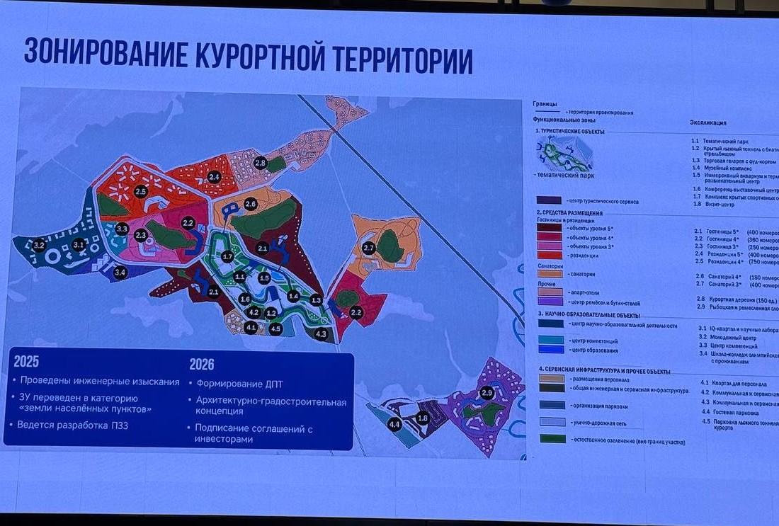 Ядро курорта займёт около 28 гектаров, однако общая площадь, отведённая под проект, гораздо больше. Территорию заранее разделят на зоны с учётом будущего расширения, чтобы развитие шло поэтапно. На текущий момент, по словам Андрея Пантелеева, ключевые земельные вопросы уже решены.