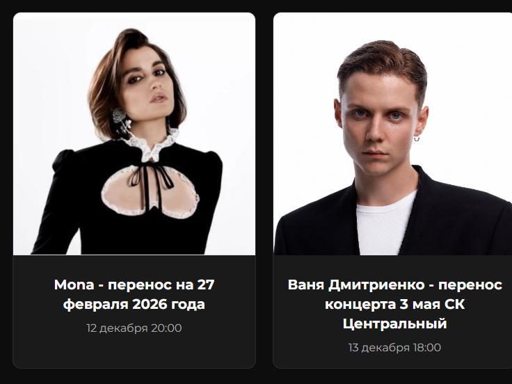 Концерт исполнительницы Mona, запланированный в Тюмени на 12 декабря, также отменен и перенесен. Его проведут 27 февраля следующего года. Причины переноса не разглашаются, однако в своем телеграм-канале певица неоднократно упоминала о продолжительной болезни.