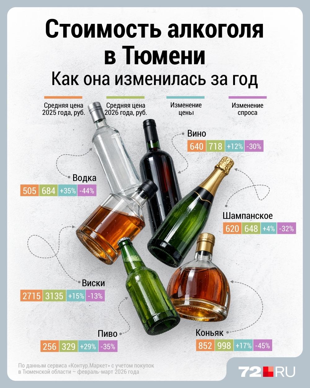 «Весь алкоголь прибавил в цене и упал в спросе. В среднем цена на алкогольные напитки по Тюменской области за год повысилась на 19%, а спрос упал на 34%», — сообщили 72.RU эксперты.