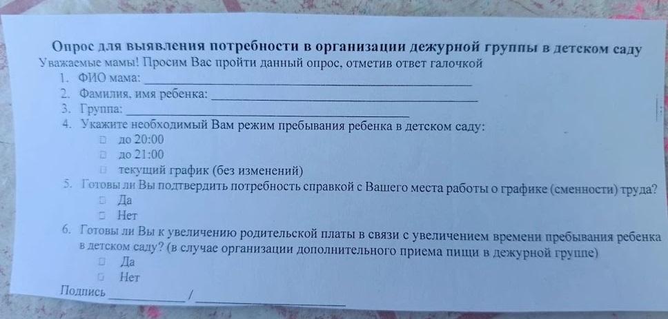 Опросные листы включают пункты о графике работы родителей и их готовности согласиться на увеличение платы за детский сад.