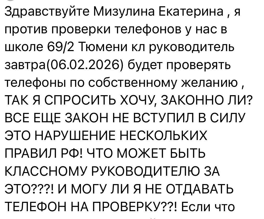 Учащиеся тюменских школ сообщают о случаях проверки личных мобильных телефонов и аккаунтов в социальных сетях со стороны педагогов. Например, в школе №69/2 классный руководитель, по словам школьников, назначила подобный осмотр. Об этой ситуации подростки написали общественному деятелю Екатерине Мизулиной.
