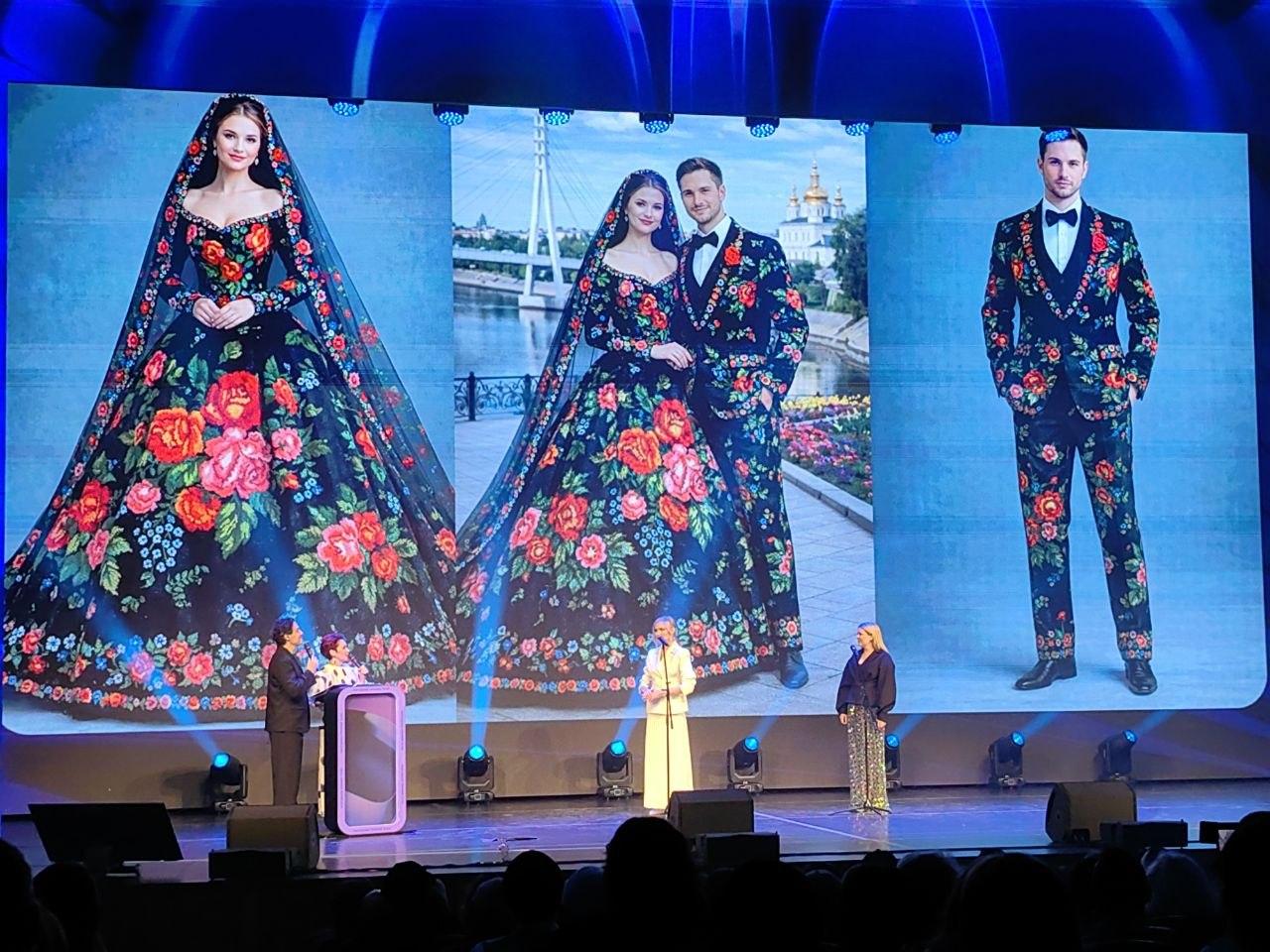Ранее в рамках шоу-программы на сцене демонстрировали арт-объект — свадебное платье, стилизованное под традиционный тюменский ковер, после чего и последовал вопрос ведущего.