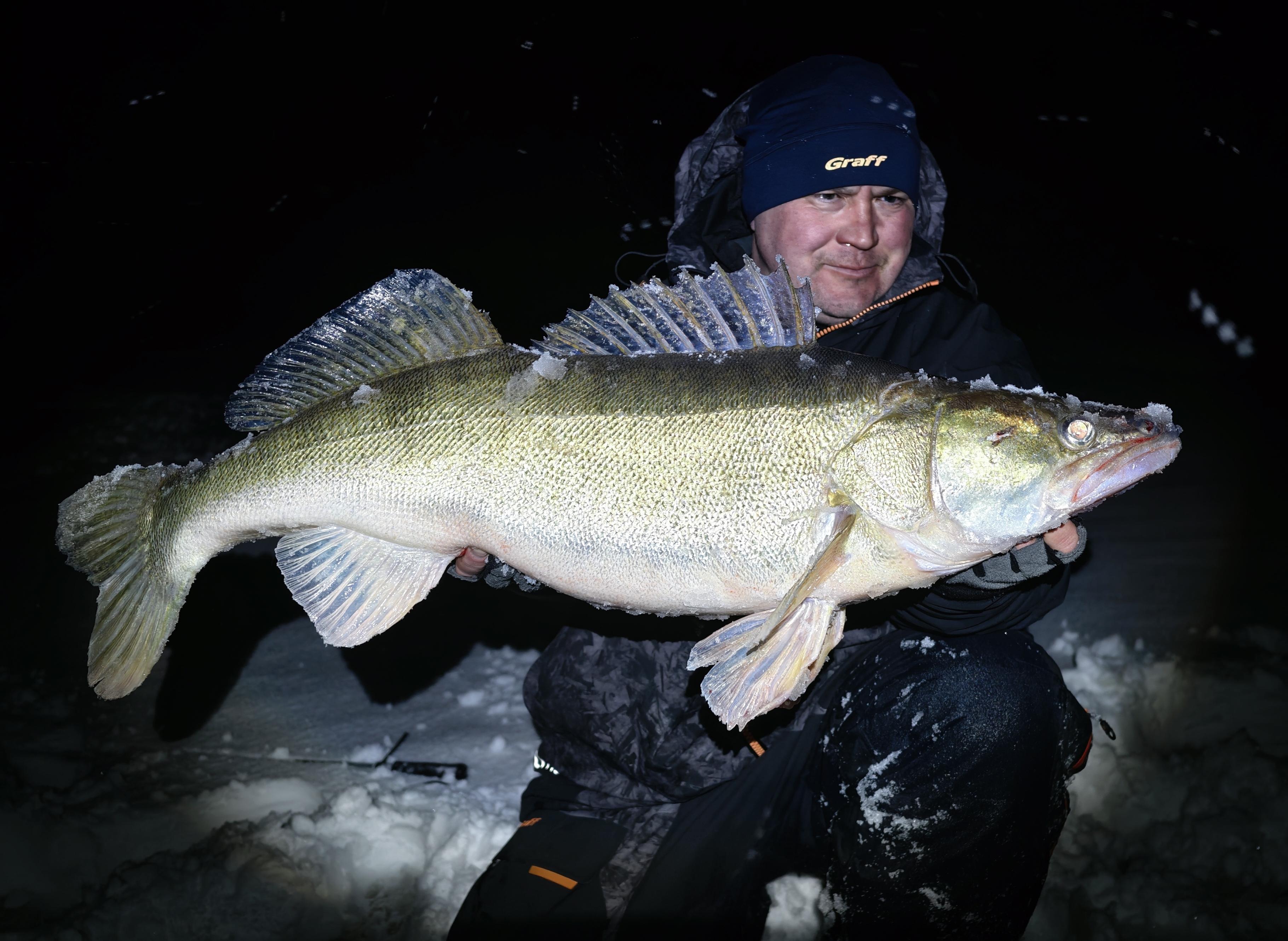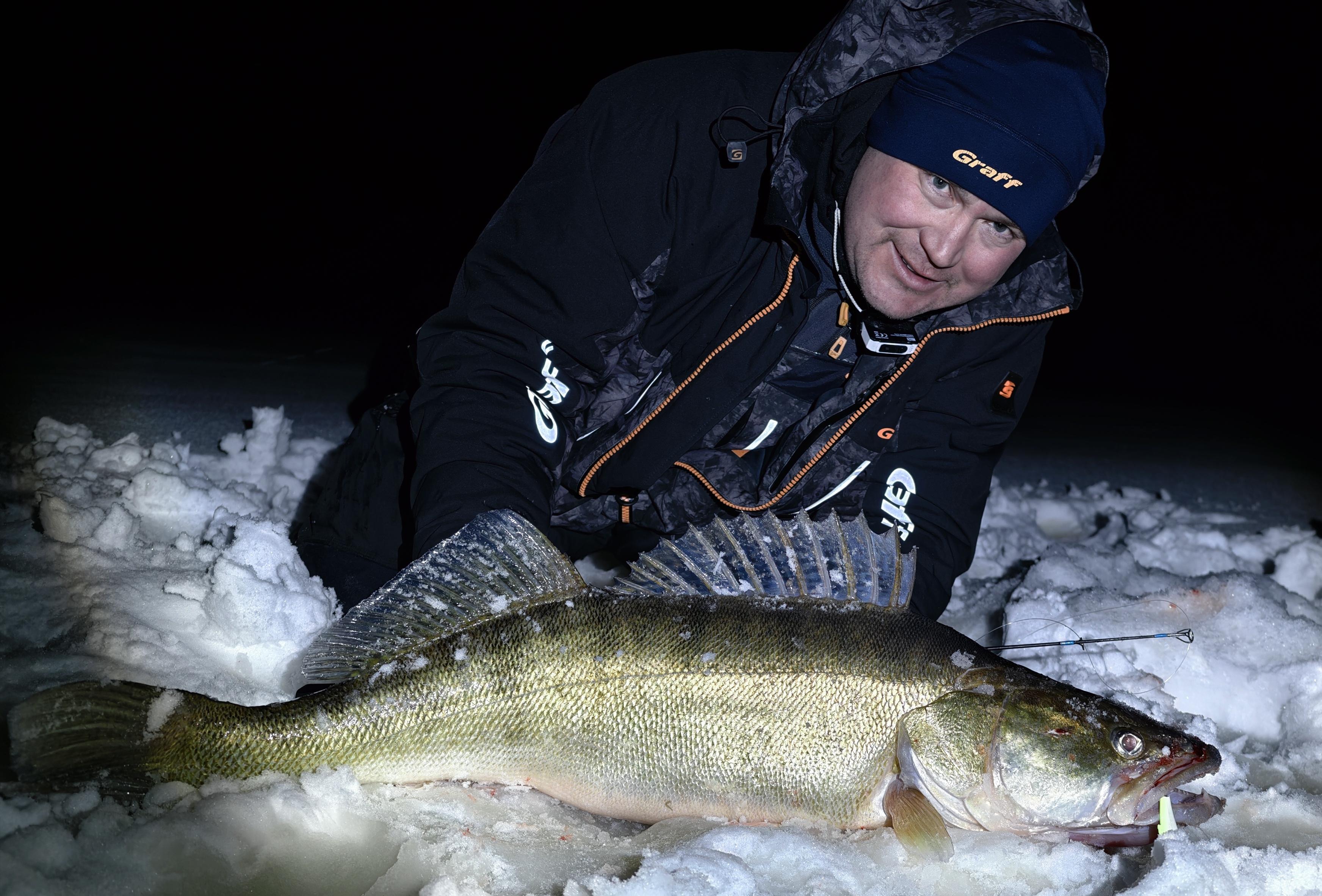 «Крупные судаки пугливые. Конечно, такая рыба не боится, когда над ней просто проходишь по льду, но как только начинаешь бурить лунку, то 90% сразу срывается с лежки. За пойманным гигантом мы гонялись около часа! Пробурили около трех десятков лунок и высадили аккумулятор из-за одной только рыбы. В итоге нам повезло: судак лег под одну из ранее пробуренных лунок, приманку снесло куда надо, далее несколько минут уговоров и Годзилла поднялся со дна. Он подошел к приманке», — рассказал Руслан Файзуллин.