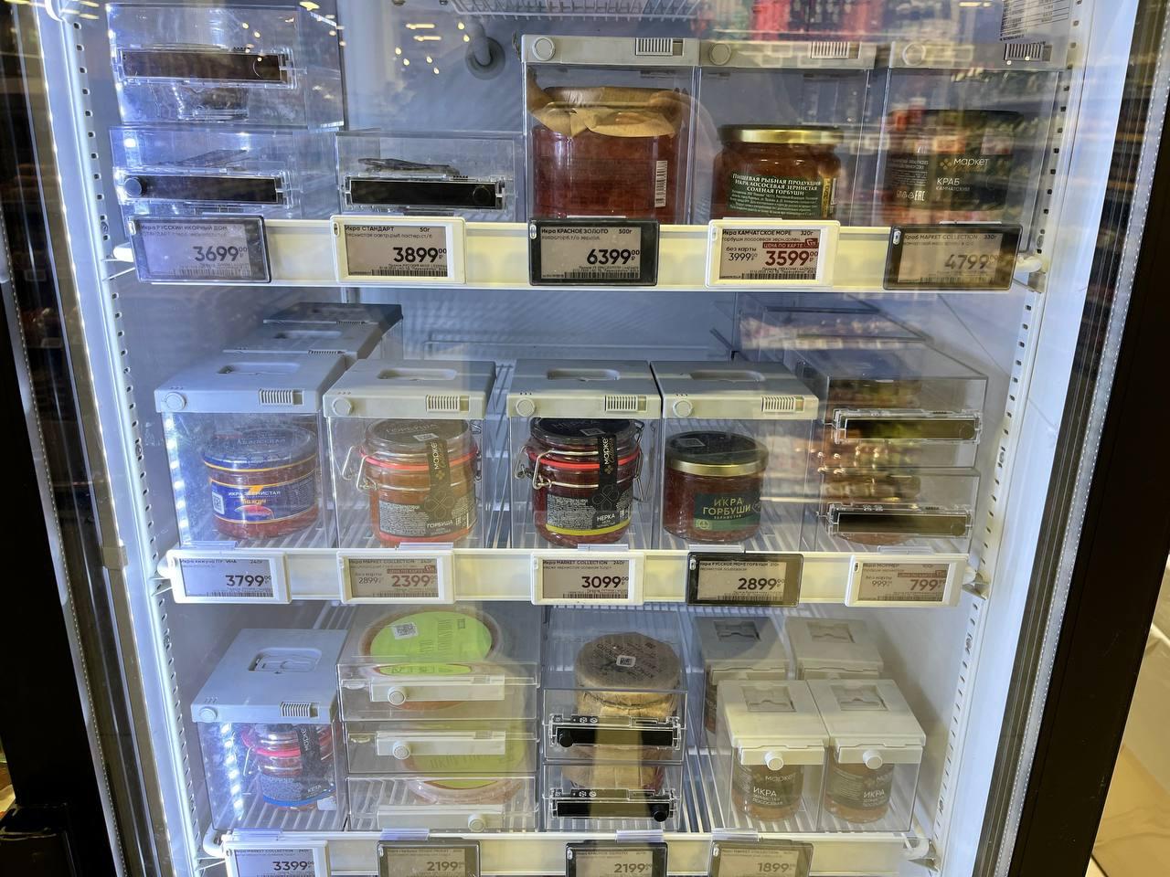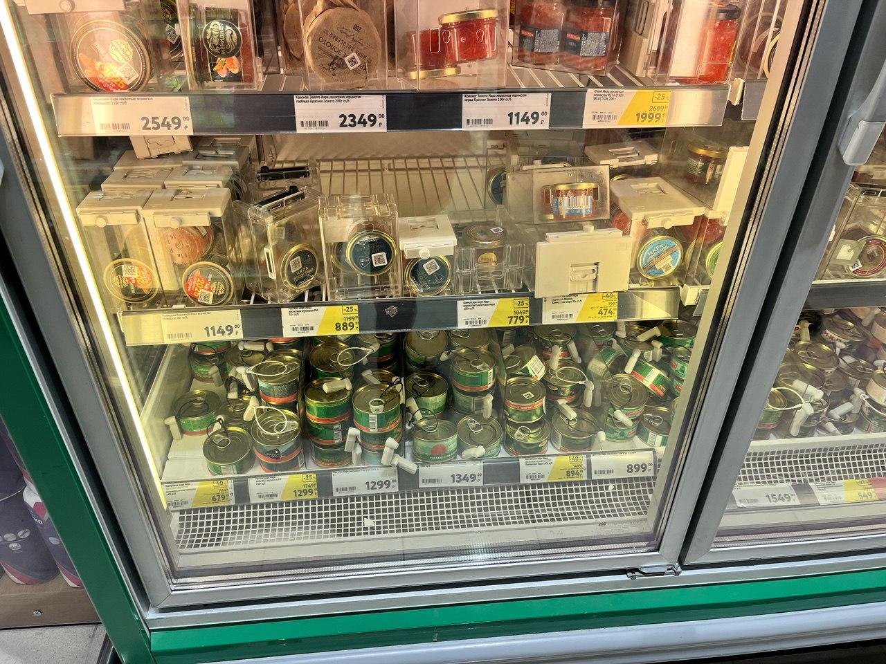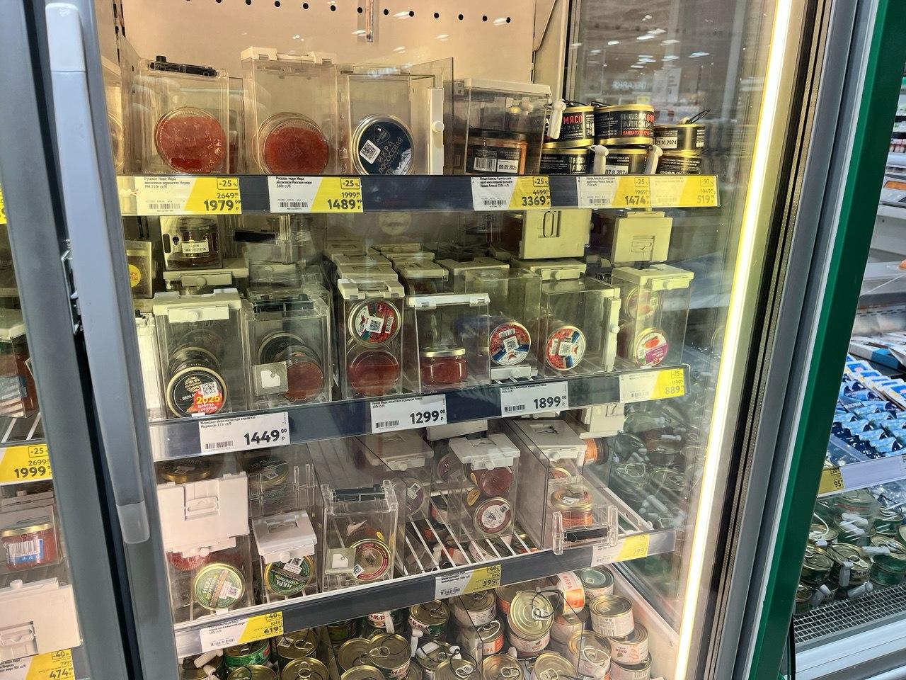 Этот супермаркет предлагает икру в больших объемах, но и цены здесь выше. Например, продукт под названием «Красное золото» весом 500 граммов оценивается в 6399 рублей — это самая дорогая и крупная упаковка. За месяц ее цена увеличилась на 100 рублей. Банки по 95 граммов стоят от 779 рублей.