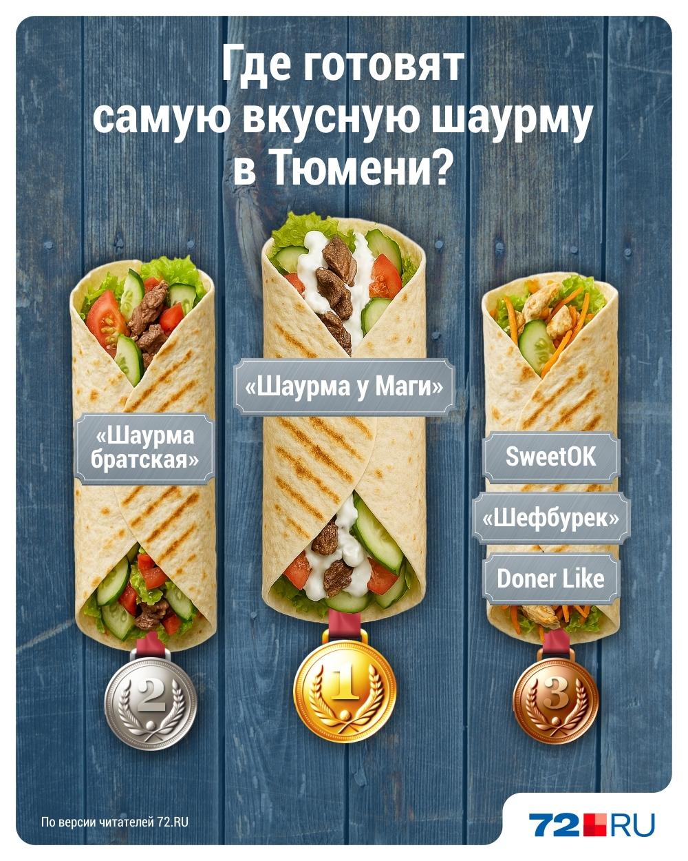 Абсолютным лидером стала «Шаурма у Маги» на улице Сакко, 5. Второе место заняла «Шаурма братская». На третьей позиции оказались сразу три точки: SweetOK, «Шефбурек» и Doner Like.