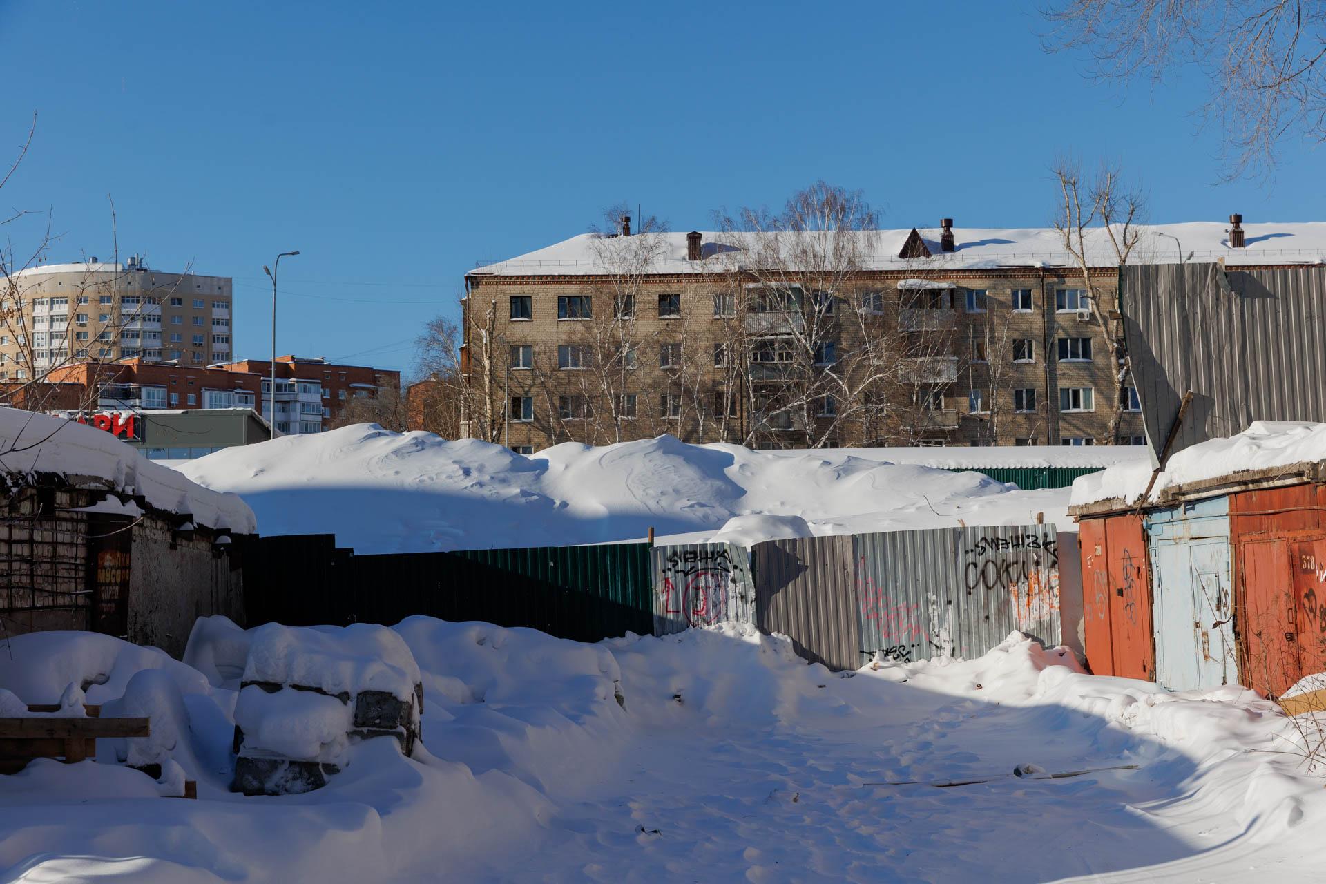 На месте многолетнего недостроенного здания в Тюмени теперь пустой участок. Фотографии демонстрируют текущий вид территории.