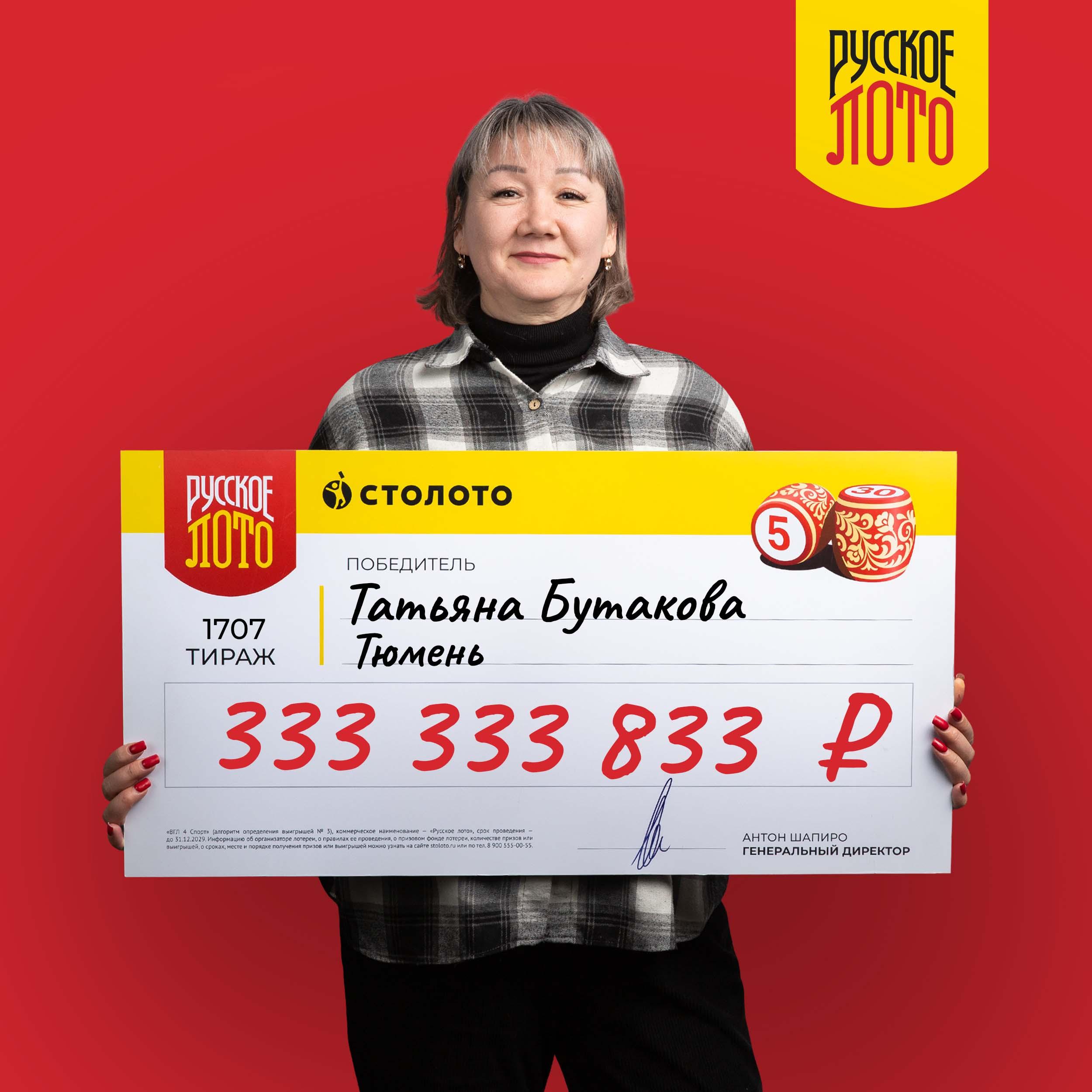 Жительница Тюмени Татьяна Бутакова выиграла 333,3 миллиона рублей в новогоднем розыгрыше лотереи, который состоялся 1 января. Её личность была раскрыта 10 февраля, и оказалось, что победительница трудится кладовщицей в одной из местных больниц.