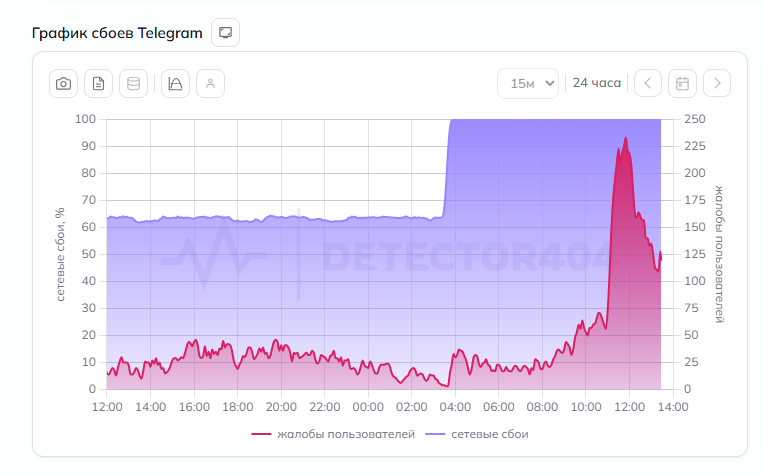 Ранее в социальных сетях распространилась информация о том, что Telegram «заблокирован на 100%». Сервис Downdetector зафиксировал всплеск жалоб на отказы в подключении к мессенджеру.