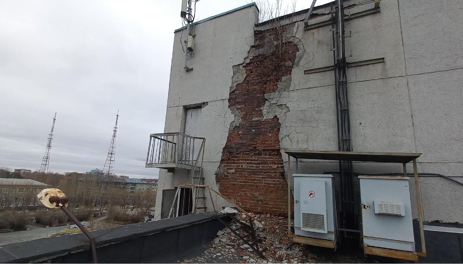 Штукатурка осыпается, обнажая кирпичную кладку.