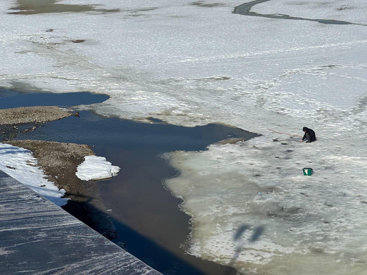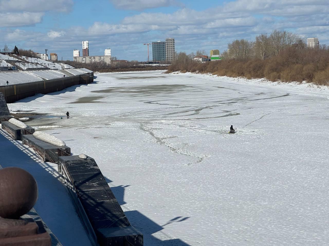 С наступлением тепла на ледовой поверхности реки Туры в Тюмени активизировались рыбаки. Их заметили в центральной части города, недалеко от моста Влюбленных.