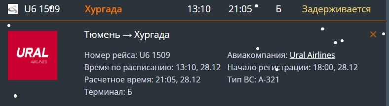 «Чартерный рейс U6-1509 в Хургаду задерживают в аэропорту Рощино. Борт принадлежит «Уральским авиалиниям», но эксплуатантом выступает компания «ФанСан», — сообщил журналисту один из туристов. — Чтобы избежать предоставления гостиницы, вылет переносят на 7 часов 55 минут!»