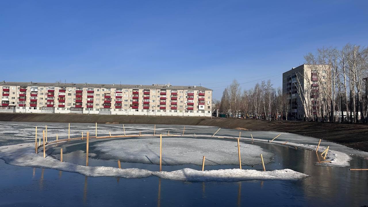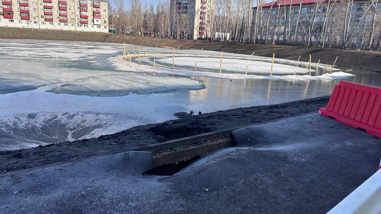 После зимы на Утином пруду обнаружились дефекты: размытый асфальт и остатки ограждения катка в недавно очищенном водоеме.