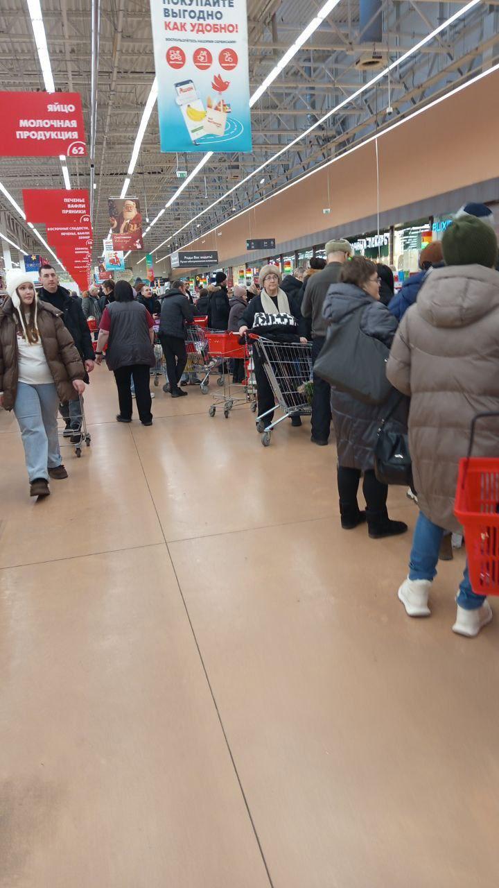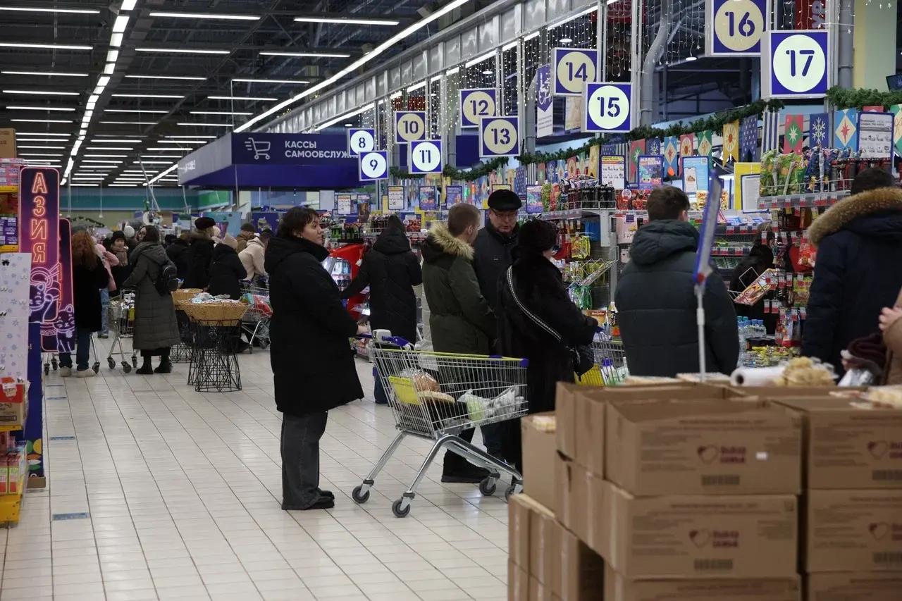 Предновогодняя суета охватила магазины Тюмени. Жители города делятся в соцсетях кадрами из торговых центров, где выстроились длинные очереди. В корзинах покупателей не остаётся свободного места: там лежат мандарины, рыба и различные сладости.