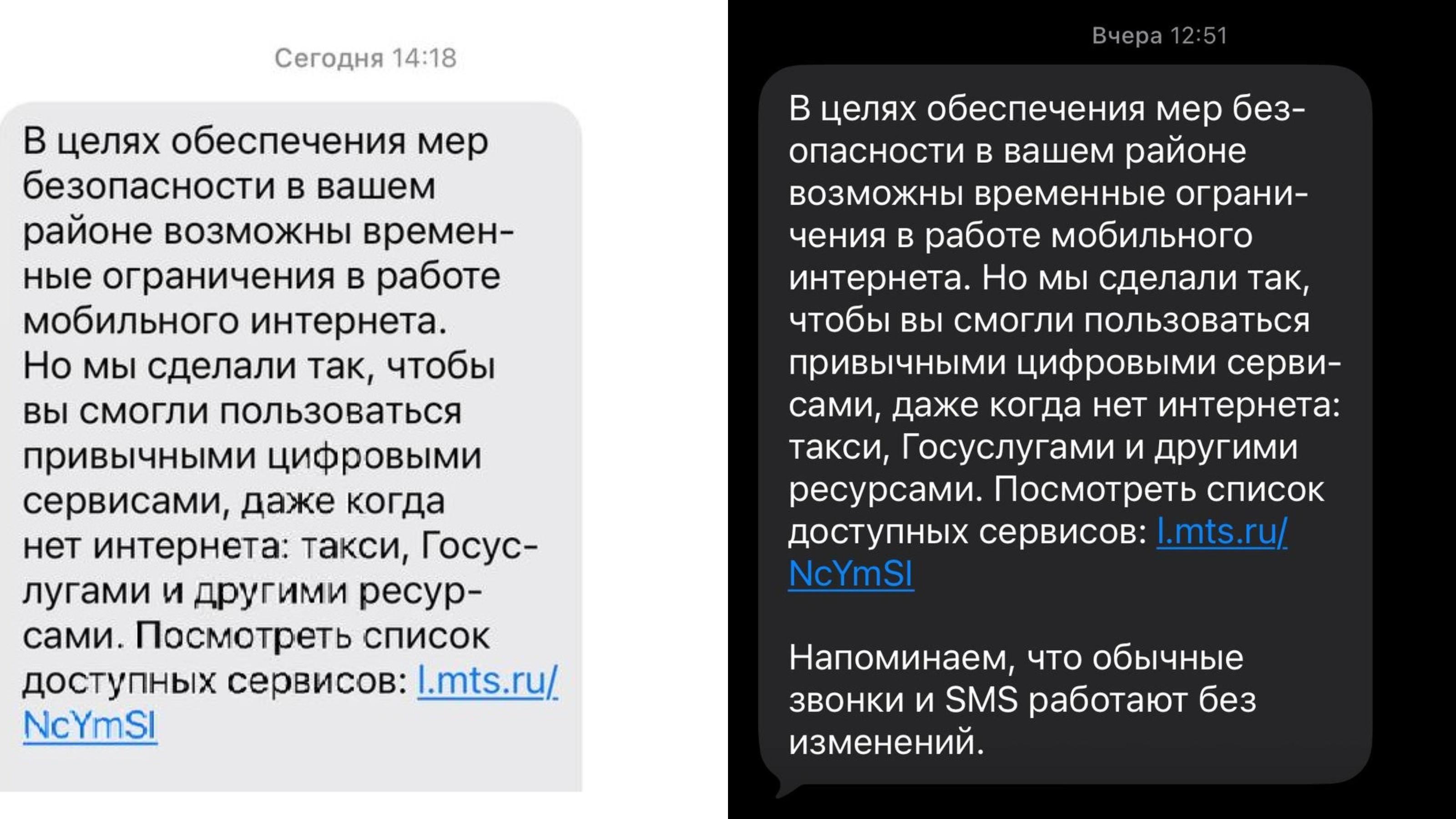 В сообщении оператора говорится: «В целях обеспечения мер безопасности в вашем районе возможны временные ограничения в работе мобильного интернета. Но мы сделали так, чтобы вы смогли пользоваться привычными цифровыми сервисами, даже когда нет интернета: такси, „Госуслугами“ и другими ресурсами».