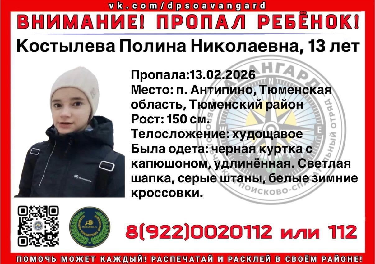 В Тюмени организованы масштабные поиски 13-летней девочки, пропавшей в районе Антипино. С пятницы, 13 февраля 2026 года, её разыскивают родственники, сотрудники полиции, а также добровольцы из отрядов «Тюменьрегионспас» и «Авангард».