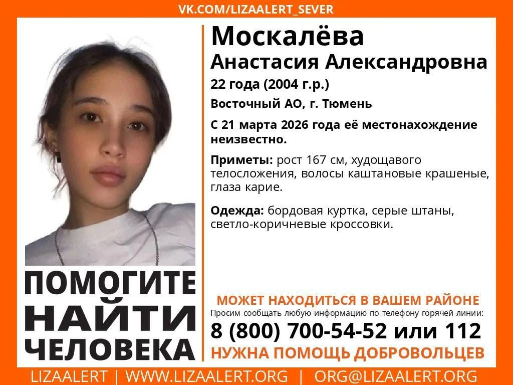 Поисковый отряд «ЛизаАлерт» объявил о пропаже 22-летней Анастасии Москалёвой в Тюмени. Девушка исчезла 21 марта, и с того дня её местонахождение неизвестно.