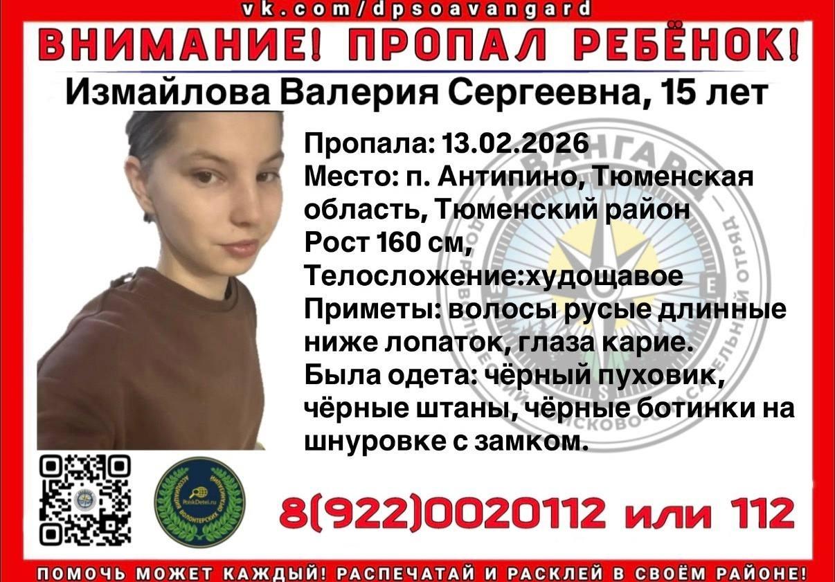 15-летняя Валерия Измайлова пропала в районе Антипино. Это второй случай исчезновения несовершеннолетней за день.