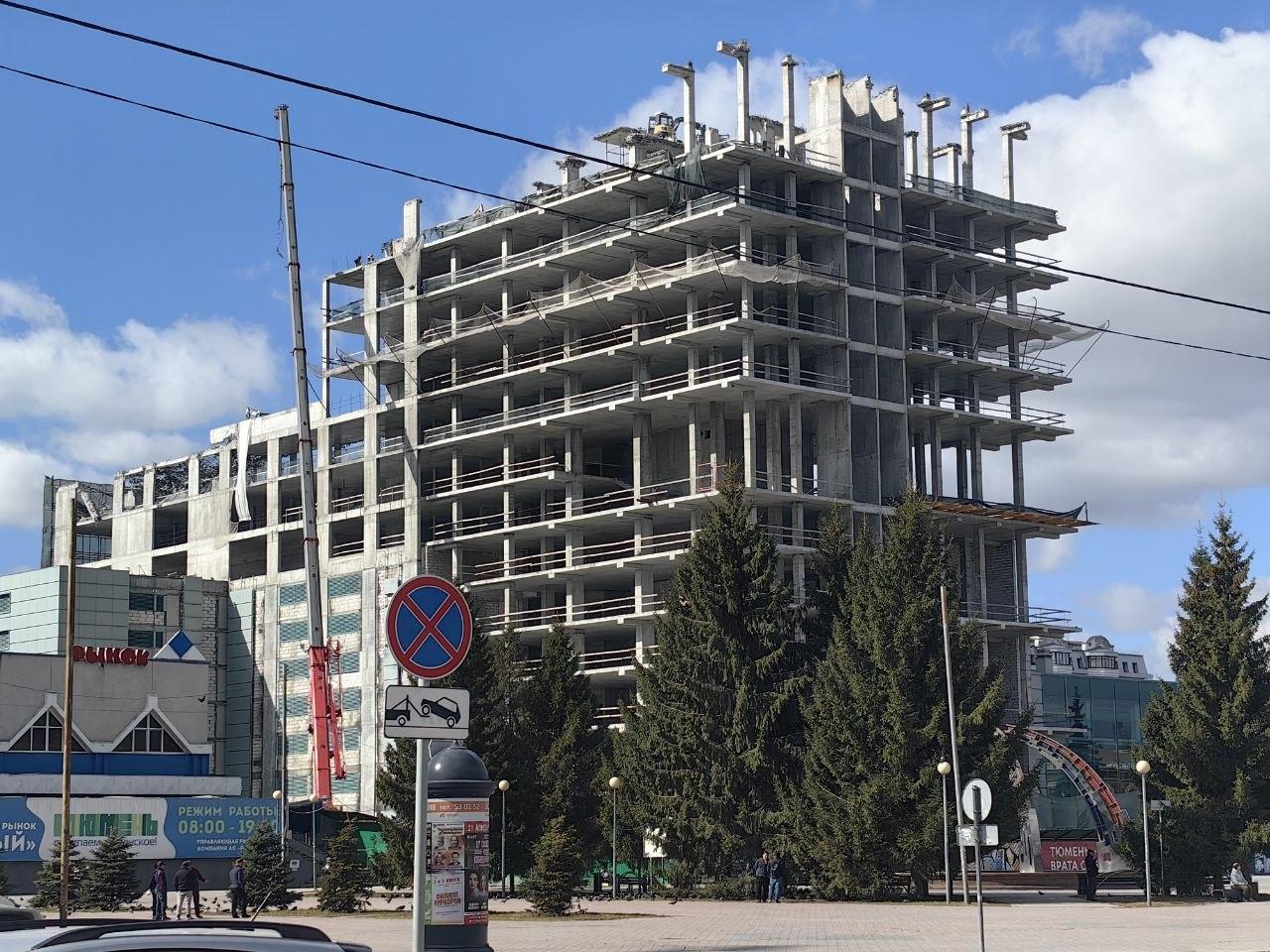 В центре Тюмени продолжается снос высотного здания, которое много лет стояло недостроенным рядом с ЦУМом. Первоначально объект предназначался для офисов, но проект был заморожен. Недавно собственником стала компания «Домина-Т», связанная с местным предпринимателем Владимиром Шевчиком.
