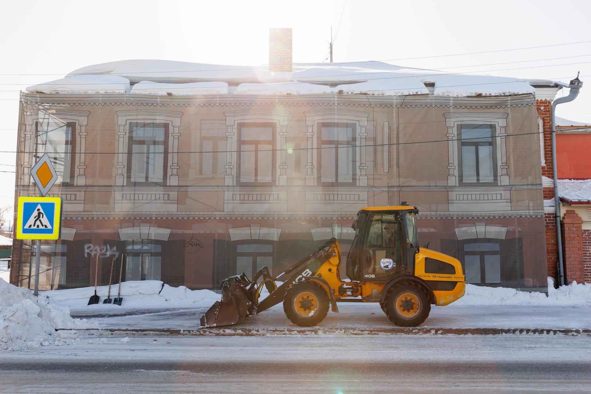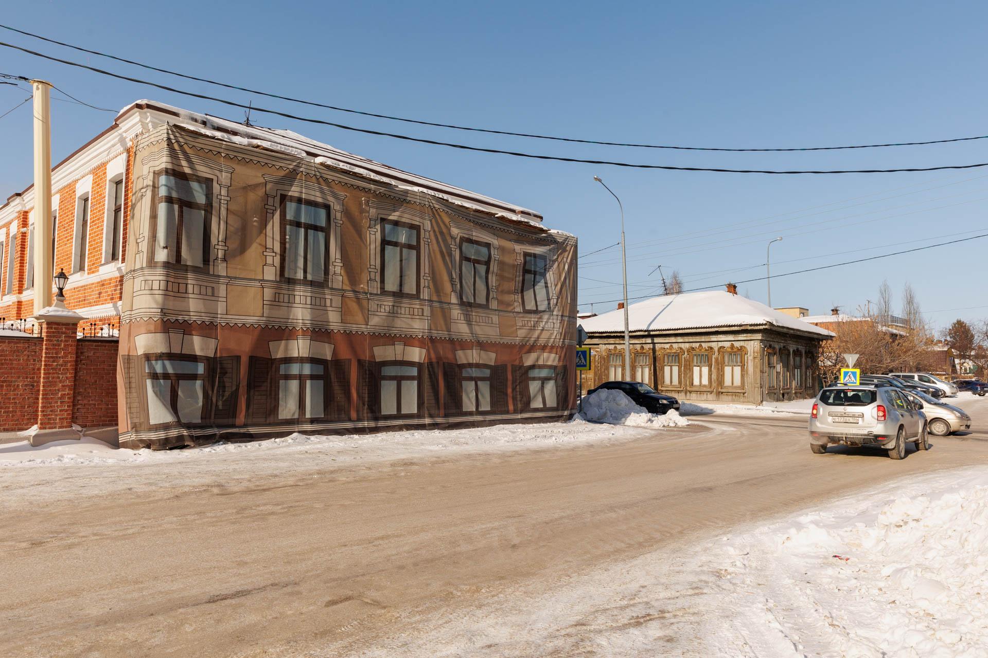 Историческое здание на улице Камышинской ожидает реставрация. В настоящее время оно закрыто фальшфасадом.