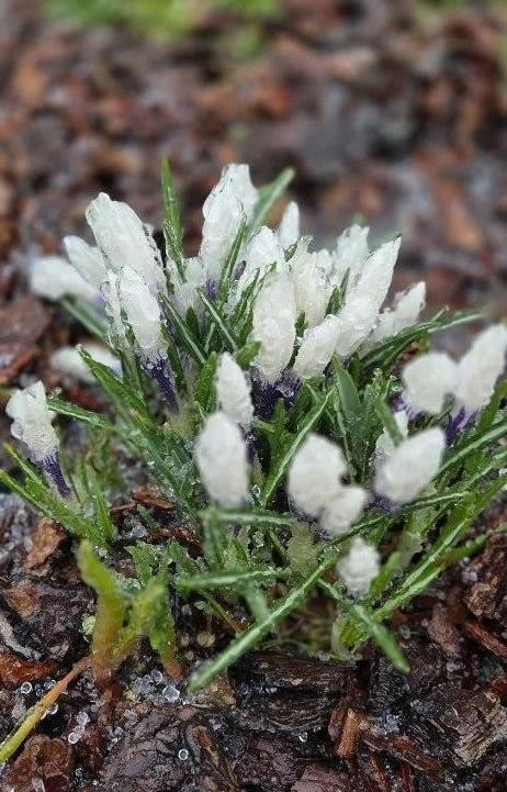Газон покрыт снегом, а ветви деревьев скованы ледяной коркой.
