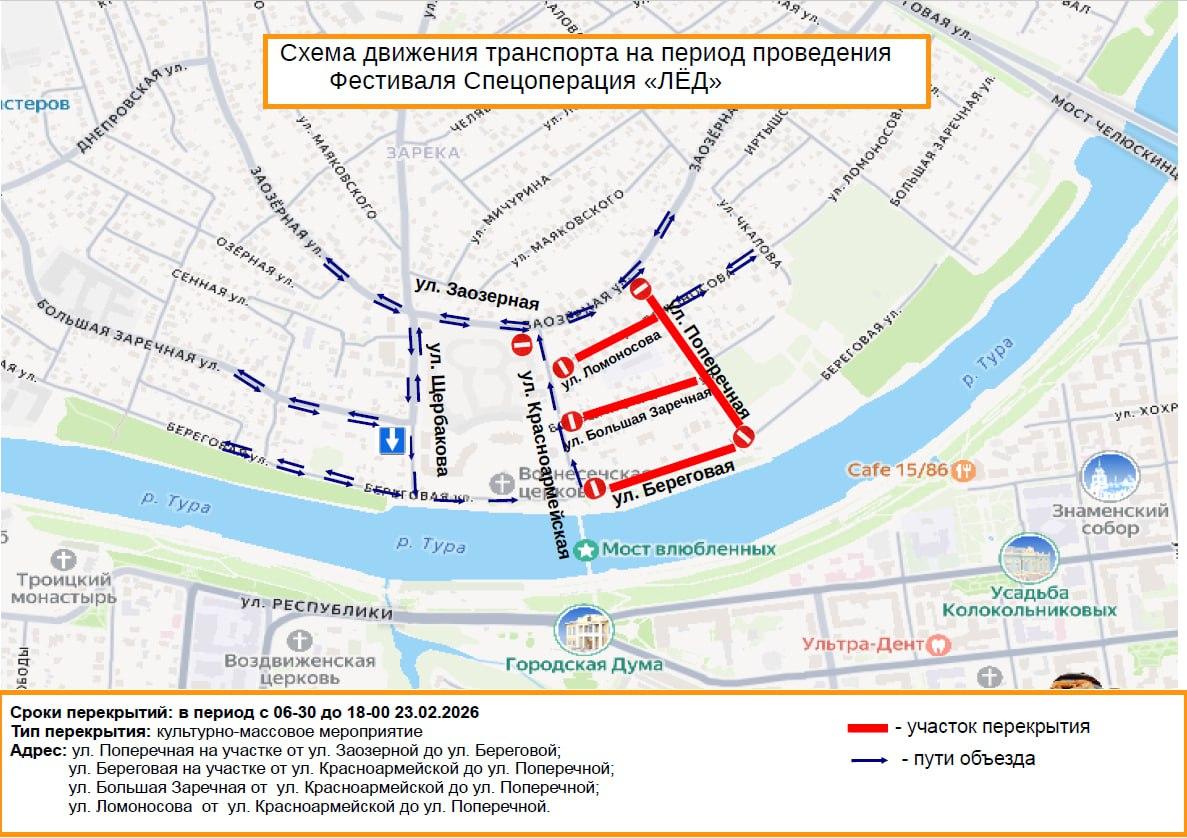 23 февраля, в пятницу, в Заречной части Тюмени будет временно прекращено движение транспорта по ряду улиц. Ограничения действуют с 6:30 до 18:00.
