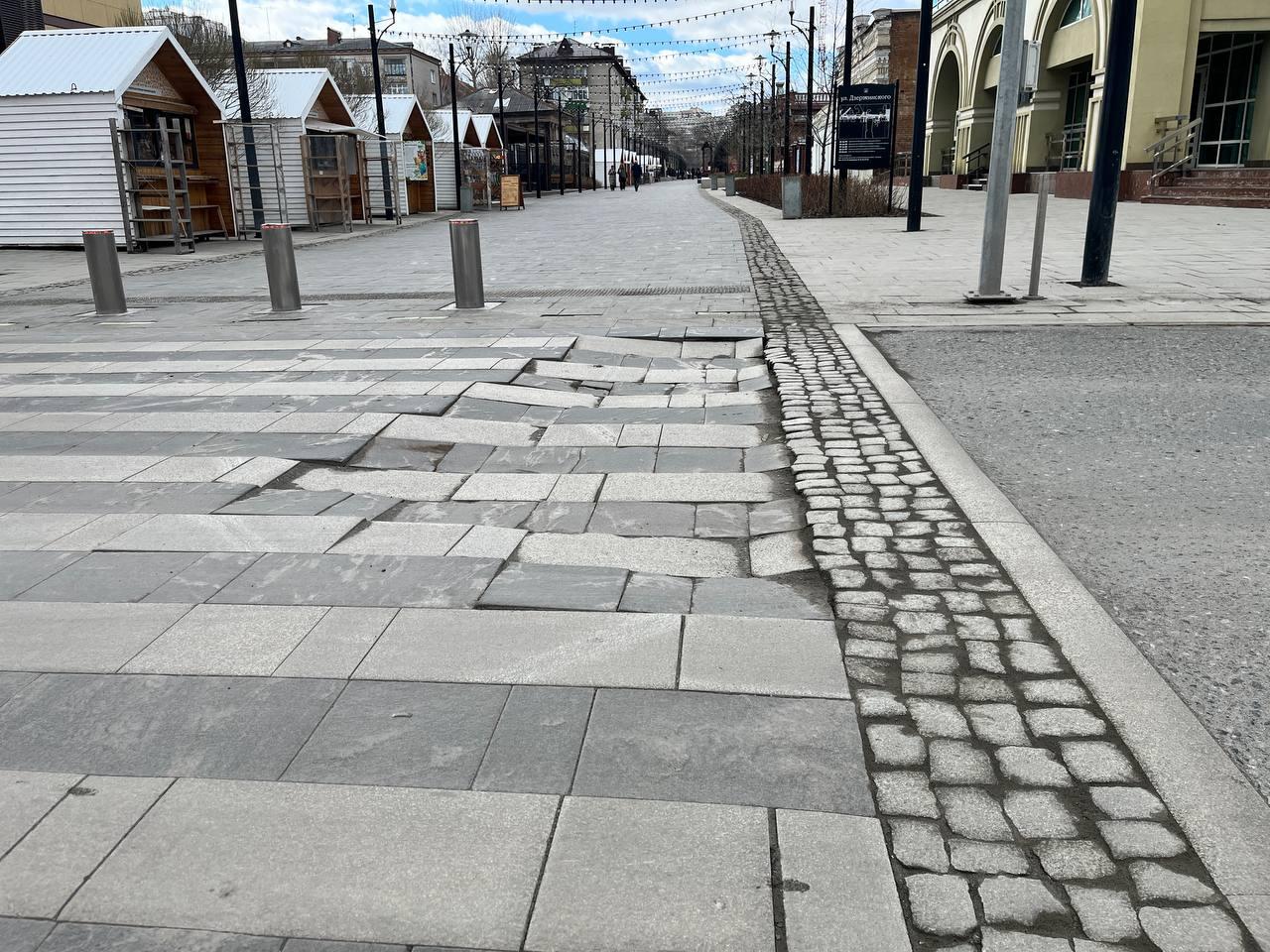 Дорожная плитка просела на пешеходном переходе в центре Тюмени, где проходит прогулочная улица Дзержинского и пересекается с Советской. Местные жители заметили повреждение уже некоторое время назад.