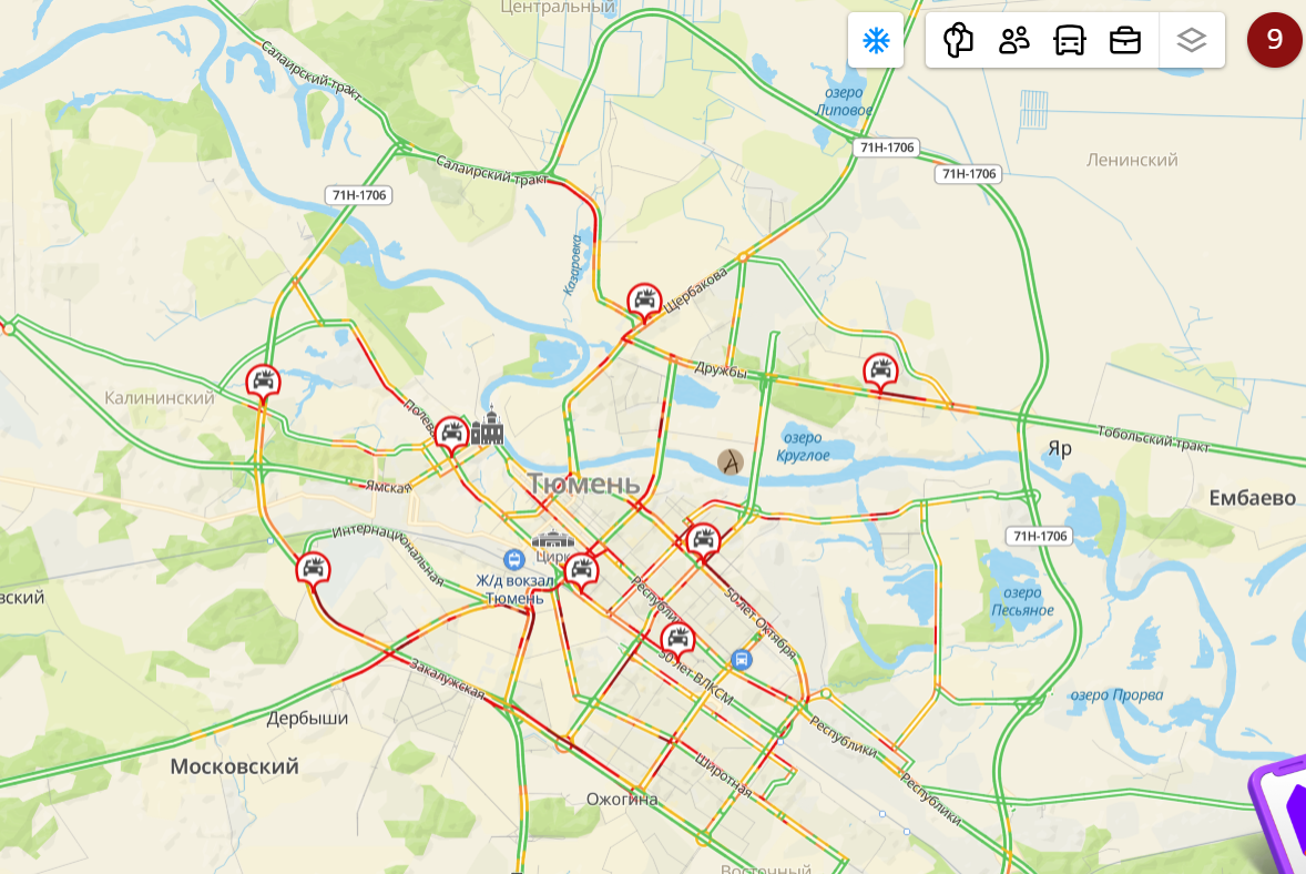Сервисы мониторинга пробок оценивают текущую дорожную ситуацию в городе на 9 баллов из 10.