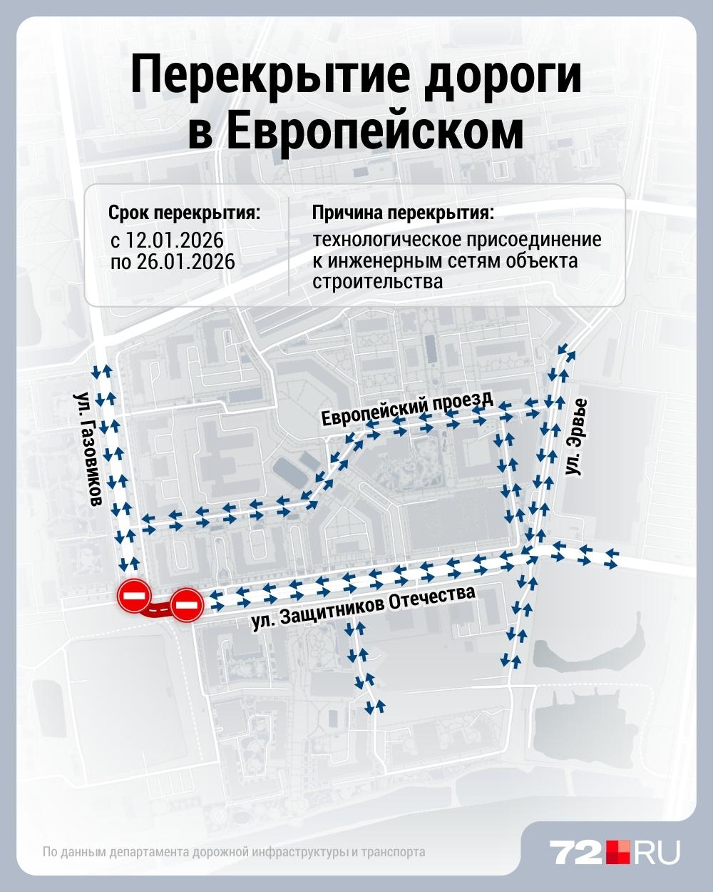 Улицу Защитников Отечества в Европейском районе Тюмени временно закроют для движения. Решение принял департамент дорожной инфраструктуры и транспорта в связи с необходимостью подключения к инженерным сетям.
