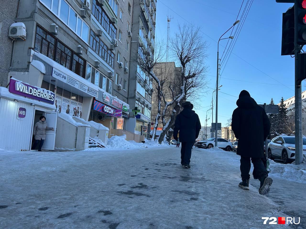 Проблема скользких улиц и тротуаров остаётся актуальной для Тюмени. Горожане делятся наблюдениями о том, что гололед встречается как в центральной части, так и в спальных районах, создавая угрозу для пешеходов.